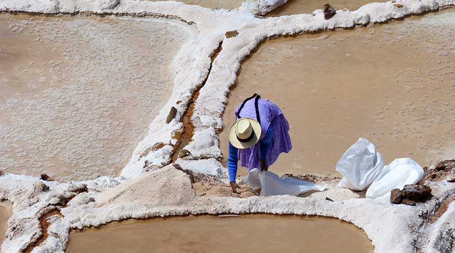 Durch die gute Lage am Hang lässt die Sonne das Wasser verdunsten und zurück bleiben die Salzkristalle. Dann wird das Salz in Säcke gefüllt und auf den Schultern bergauf geschleppt, wo es auf Lastwagen geladen wird.