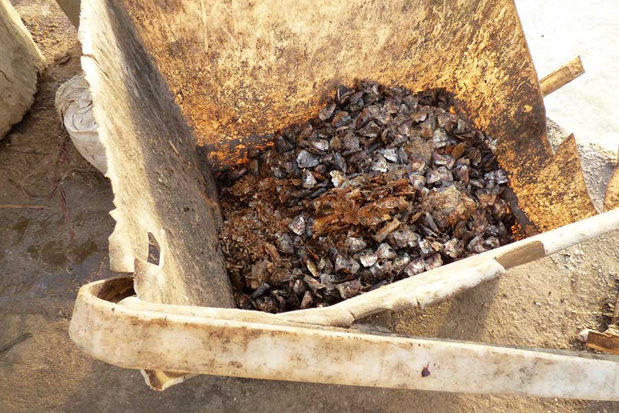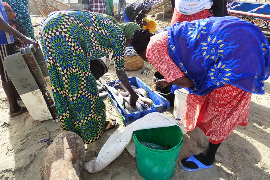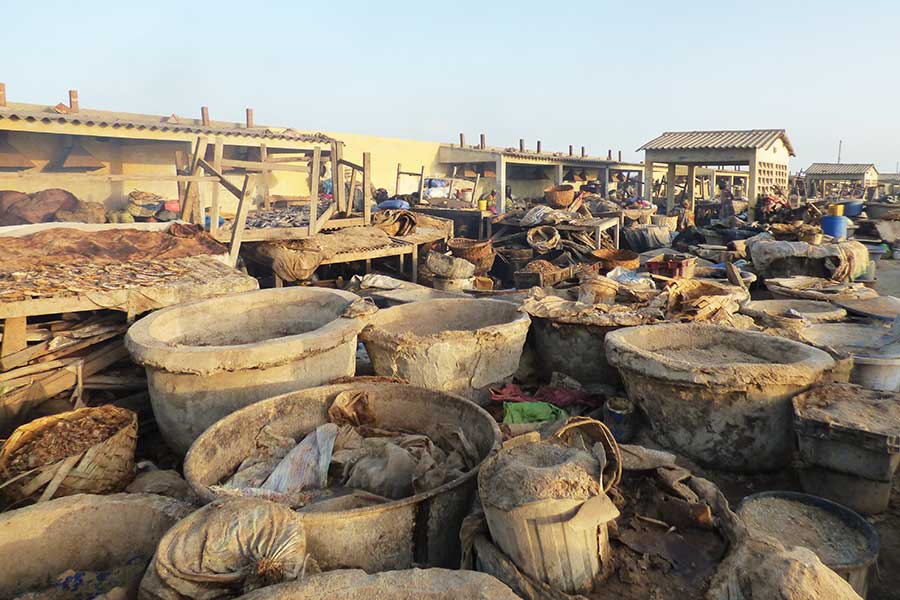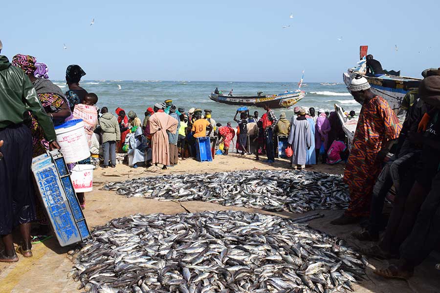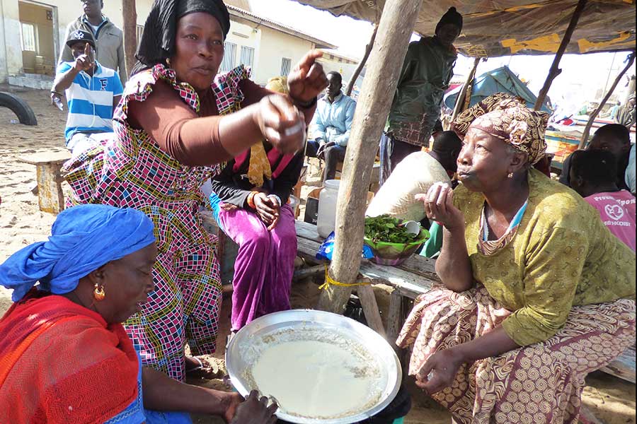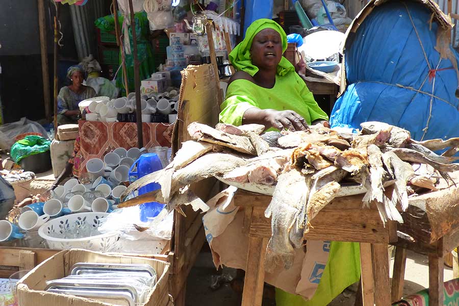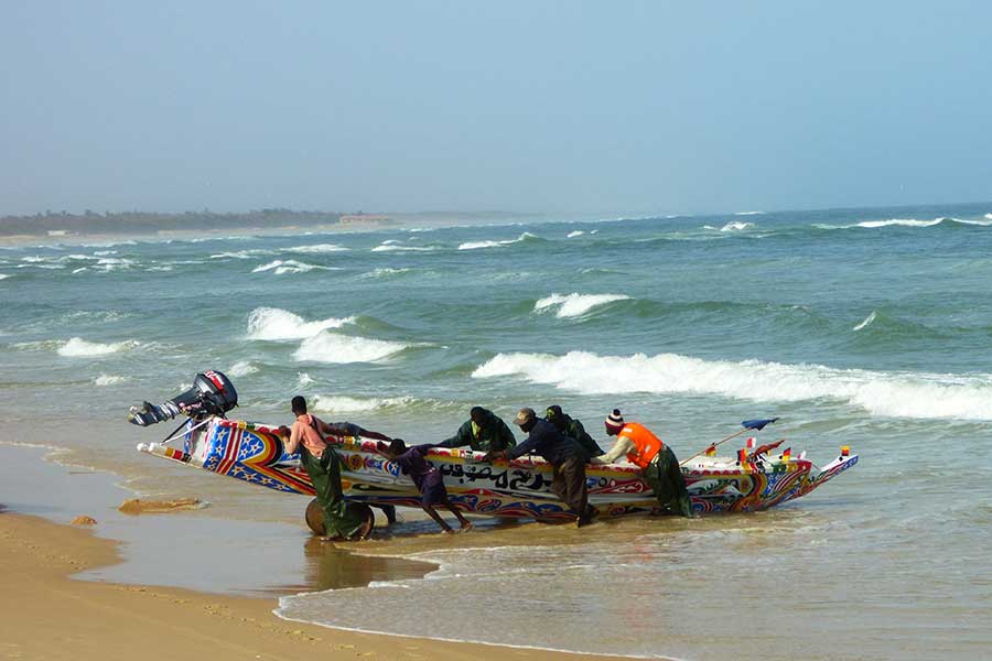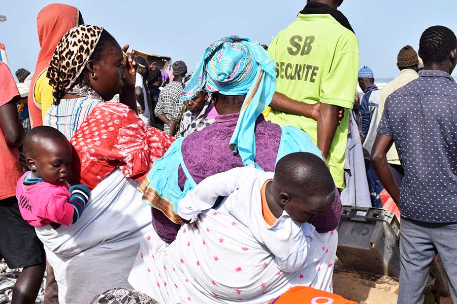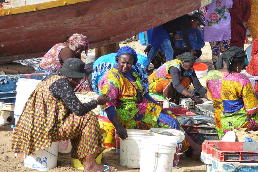 Wir nahmen Abschied vom Salzsee und machten nach einer Stunde Halt im Fischerdorf Kayar, um für 45 Minuten die bunt bemalten Pirogen und das quirlige Treiben auf dem Fischmarkt zu beobachten. Besonders interessant war das am offenen Stand angebotene Fleisch sowie die bunt gekleideten Frauen, die auf die eintreffenden Fischerboote warteten und inzwischen landestypisch Hirsebrei aus großen Schüsseln mit der Hand aßen.