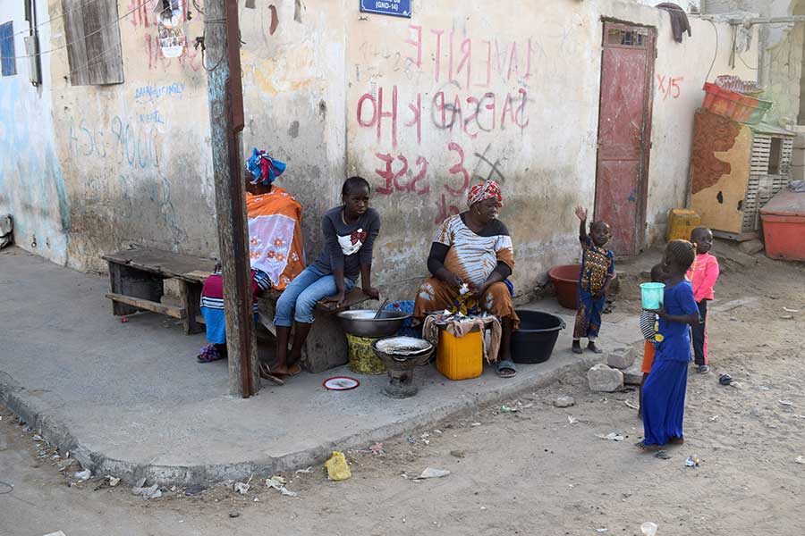 Kurz vor 14 Uhr waren wir zum Mittagessen bei einer senegalesischen Familie zurück in Saint-Louis. Dort waren die Frauen auf dem Hof mit der Zubereitung des Nationalgerichtes Thieboudienne und Yassa au poulet beschäftigt.