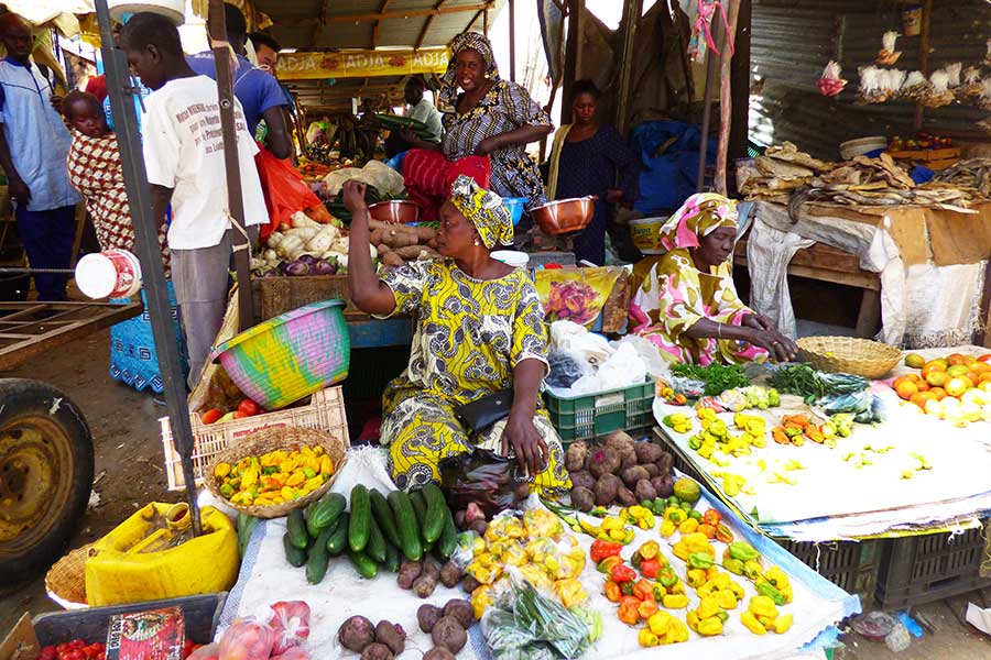 90 Minuten später besuchten wir in Thiés, der mit 240.000 Einwohnern zweitgrößten Stadt Senegals, das bunte Markttreiben. Obwohl wir schon sehr viele afrikanische Märkte gesehen haben, ist es doch immer wieder interessant, zwischen den bunten Ständen mit frischem Obst, Gemüse, Wurzeln und anderen Dingen, die das senegalesische Herz begehrt, zu spazieren und den Menschen beim Handeln zuzuschauen. Auch die für uns fremden intensiven Gerüche waren sehr interessant.
