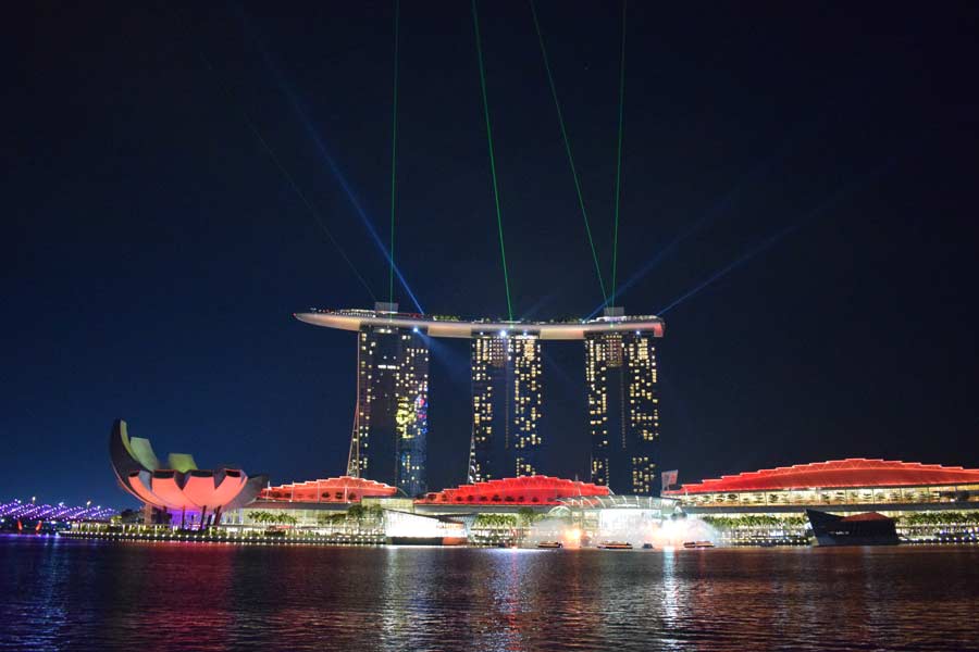 Wir gönnten uns ein gezapftes Bier für 14 Dollar sowie eine Sprite für 4 Dollar und konnten einen schönen Sonnenuntergang beobachten. 19 Uhr fuhren wir wieder nach unten, um schnellen Fußes zum Merlionpark zu gelangen, da man von dort die Lasershow auf dem Dach des Hotels sehen zu können, die aber wenig aufregend war.