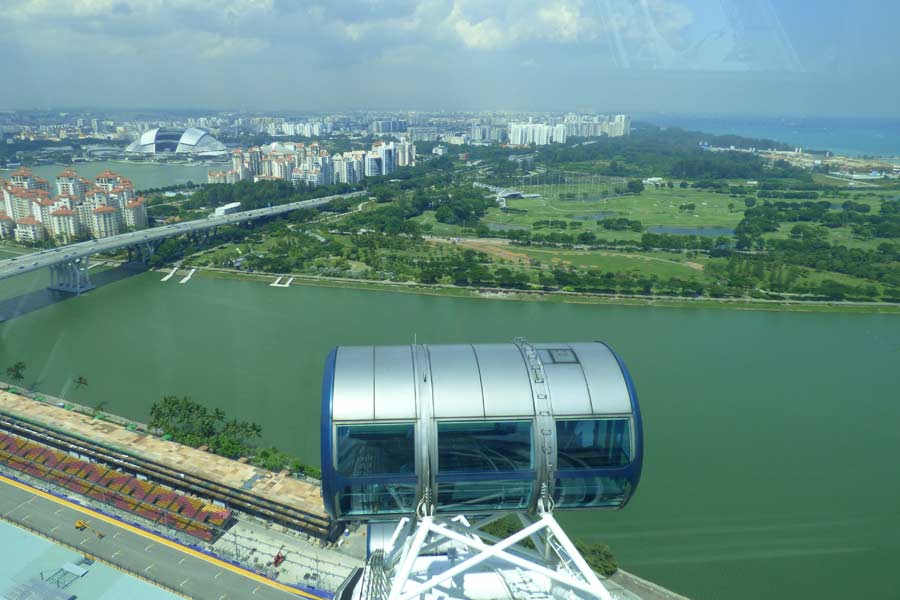 Nach dem Essen fuhren wir zum Singapore Flyer, dem mit 165 Metern zweithöchsten Riesenrad der Welt, das seit 2008 seine Runden dreht. Für 33 Dollar pro Person konnten wir eine Runde in einer knappen halben Stunde drehen. Wir waren ganz allein in einer der 28 Gondeln. Das Rad dreht sich sehr langsam und muss zum Ein- und Aussteigen nicht angehalten werden. Wir hatten bei klarem Wetter noch einmal einen wunderbaren Ausblick auf die Orte, die wir in den letzten zwei Tagen besucht hatten und waren froh, diese Attraktion noch besucht zu haben.