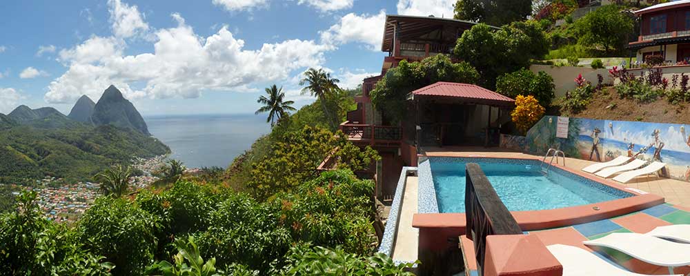 Die Lage dieser Unterkunft könnte idealer nicht sein. Freier Blick auf beide „Pitons“, die Wahrzeichen der Insel, von den geräumigen Balkons aus und ein Pool inmitten der exotischen Pflanzenwelt.