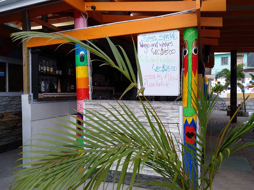 Ein Bummel durch die von bunten Häusern gesäumten Straßen sowie am Wasser und ein schmackhaftes preiswertes Essen (Wings & Wedges für 15 XCD) rundeten diesen Nachmittag ab.