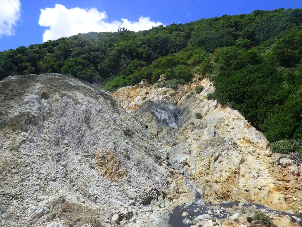 Am Diamant Wasserfall fällt mit Regenwasser vermischtes Wasser aus Schwefelquellen etwa 17 Meter in die Tiefe. Der felsige Untergrund hat auf Grund der Mineralien verschiedene Färbungen.