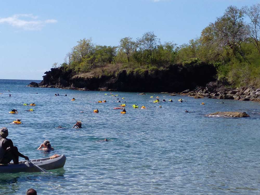 Der einzige Nachteil dieses Strandes ist, dass nachmittags gegen 15 Uhr zahlreiche Katamarane mit Passagieren von den Kreuzfahrtschiffen hier für eine halbe Stunde zum Baden und Schnorcheln anlegen und es plötzlich im Wasser von Leuten wimmelt. Danach kehrt zum Glück wieder Ruhe ein.