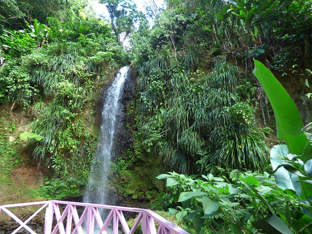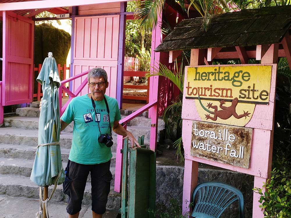 Heute besuchten wir nach einem angenehmen Frühstück um 9 Uhr den direkt an der Straße nach Fond St. Jacques liegenden Torrail-Wasserfall. Außer uns waren in dem kleinen angelegten Garten nur zwei Arbeiter dort, die versuchten, das Becken unterhalb des 15 Meter hohen Wasserfalls abzudichten, in dem man normalerweise auch Baden kann. Einer von beiden kassierte die 3 US-Dollar Eintritt für das wenig spektakuläre Erlebnis.