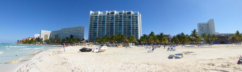Um 17 Uhr erreichten wir verbliebenen Sechs unser Hotel Beachscape Kin Ha Villas & Suites. Es liegt im Norden von Cancún direkt am breiten weißen Sandstrand mit Kokospalmen. Ganz in der Nähe befinden sich kleine und größere Supermärkte, verschiedene Restaurants, gemütliche Bars und viele Geschäfte.