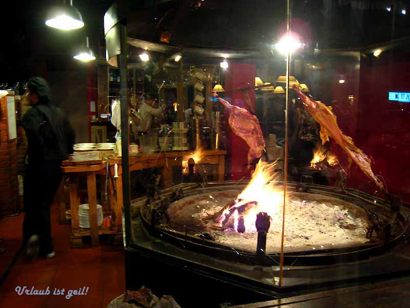 Bei einem Bummel zu fünft durch den beschaulichen Ort kosteten wir das vorzügliche argentinische Eis. Es gab überall Läden mit haufenweise Schokolade und anderen Süßigkeiten in denen man sich zunächst an der Kasse anstellen musste um einen Bon zu kaufen und danach noch einmal am Eisstand wartete, um gegen den Bon sein Eis zu erhalten. Mittags kehrten wir in ein landestypisches Restaurant ein, wo wir beobachten konnten, wie unser 400-Gramm-XXL-Fleisch vom Filetstück geschnitten und auf dem Grill hervorragend gegart wurde – es schmeckte super! Der vom Wirt empfohlene selbstgemachte Himbeersaft hingegen war etwas zu süß. Unsere Frauen ließen sich den gebackenen Käse schmecken.