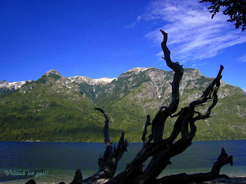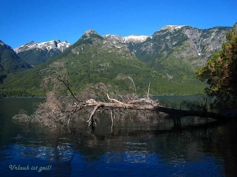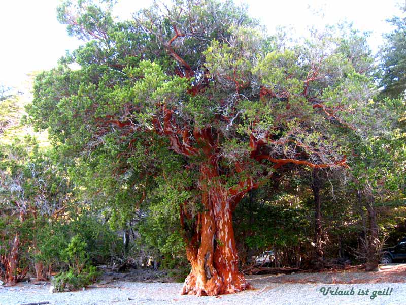 Nach dem 9 Uhr-Frühstück verbrachten wir den Vormittag mit einer sehr erholsamen Wanderung am Ufer des Sees. Die dekorativen rötlichen Bäume und die schneebedeckten Berge am Horizont boten unzählige Fotomotive. 13.30 Uhr fuhren wir zum Nationalpark Los Alerces. Nach Sonia (Auskunft der Agentur) sollte das Boot, zu dem noch eine ganze Strecke durch den Wald zu laufen war, um 14.30 Uhr ablegen. Bei Ankunft des Busses kurz vor 14 Uhr erfuhren wir, dass das Boot schon 14 Uhr ablegt. Also wurde aus der angekündigten gemütlichen Waldwanderung ein wahnsinniges Gerenne auf dem sonst so beschaulichen und nicht enden wollenden Waldweg.