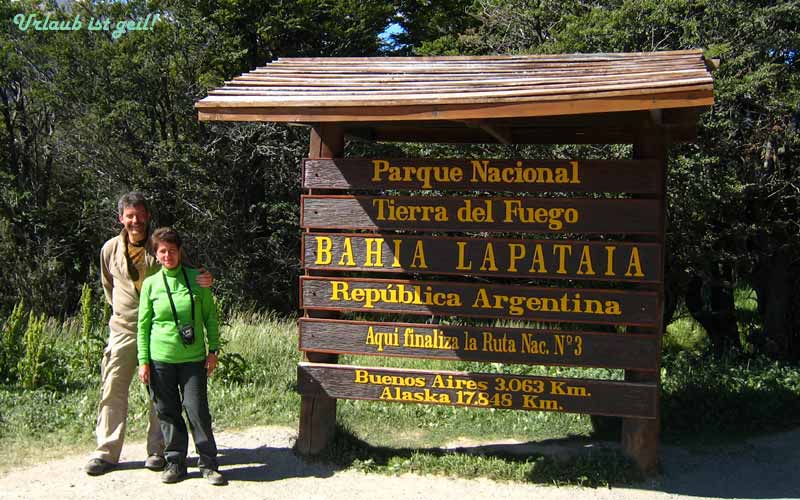 Auf der anschließenden Schlauchbootfahrt (wir zogen dafür Gummihosen, -stiefel und -jacken über) konnten wir unsere Fähigkeiten im Paddeln beweisen. Bevor es zurück zum Hotel ging, hielten wir an dem Schild, was das Ende der 4.930 km langen Nord/Süd-Route dokumentierte. Wir vier hatten uns fürs Abendessen ein „all you can eat“-Lokal ausgesucht, wo es für 46$ ein leckeres Buffet und herrlich frisch gegrilltes Fleisch vom Spieß gab. Ein Taxi brachte uns zum Hotel, wo wir schon um 21.40 Uhr – müde von der Tageswanderung – im Bett verschwanden.