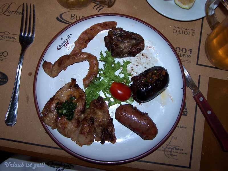 Sonia hatte für unsere Gruppe für 20 Uhr Plätze in einem Krabbenlokal bestellt. Als wir dort ankamen wusste man nur nichts davon und wir wurden inzwischen an Einzeltischen platziert – denn Sonia kam (wie meist) etwas später. Die danach eilig zusammengestellte lange Tafel war sehr eng und wir hatten nach mittlerweile 40 Minuten Wartezeit noch immer nichts zu Trinken bekommen, dass wir vier beschlossen, uns ein anderes Lokal zu suchen. Wir landeten dann einige Häuser weiter in einem einfachen Lokal, wo wir von einem sehr lustigen, flinken Ober (was für Argentinien bislang untypisch war) zügig mit hervorragenden Steaks (mit Tischgrill), einer ausgelösten Krabbe und einer großen Portion leckerem Fisch (Negro) sowie Getränken versorgt wurden.