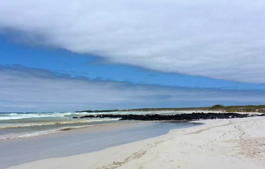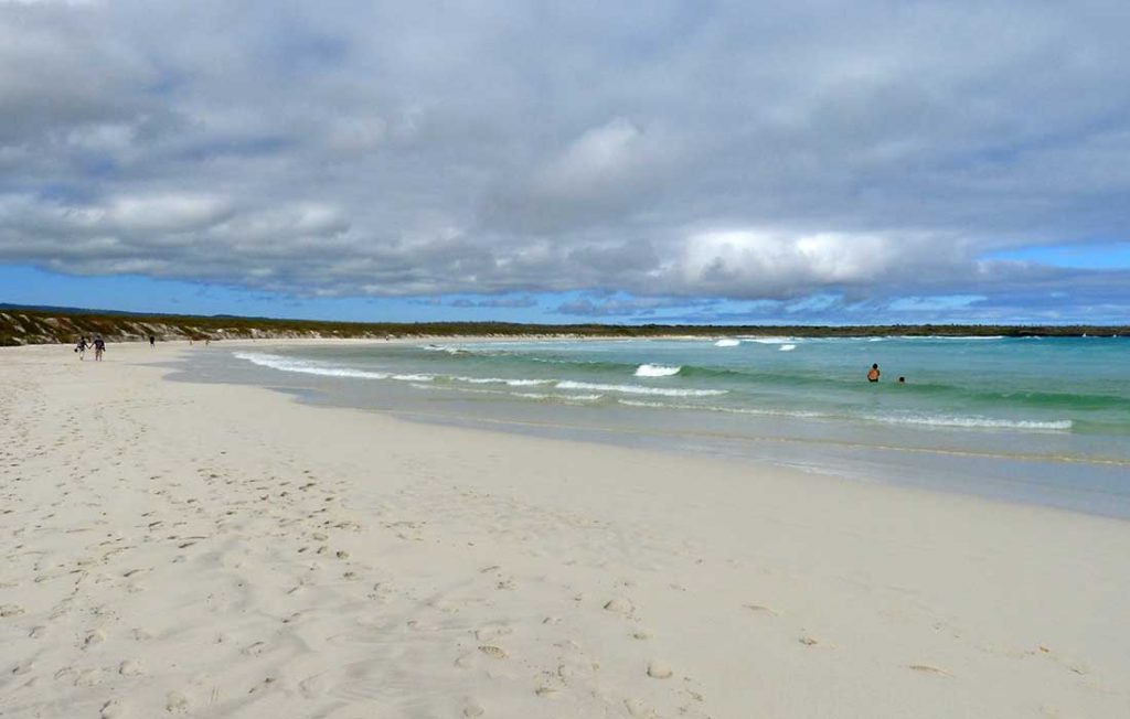 Für den heutigen Urlaubstag war kein Programm vorgesehen und wir zwei beschlossen zusammen mit Marlies und Ralf zur Tortuga Bay zu wandern. Wir packten die Badesachen und marschierten zum Parkplatz, von dem ein 2,5 Kilometer langer gepflasterter Weg zur Bucht führt. Kurz nach dem Parkplatz gelangten wir an den Eingang, hier muss sich jeder in einem Buch registrieren. Nach einer guten halben Stunde vorbei an hohen Kakteen lag der feinsandige breite Strand der Tortuga Bay vor uns. Der Himmel riss langsam auf und bald würde sich die Sonne zeigen. Nur Schatten war hier aus Mangel an Bäumen leider nirgendwo zu finden.