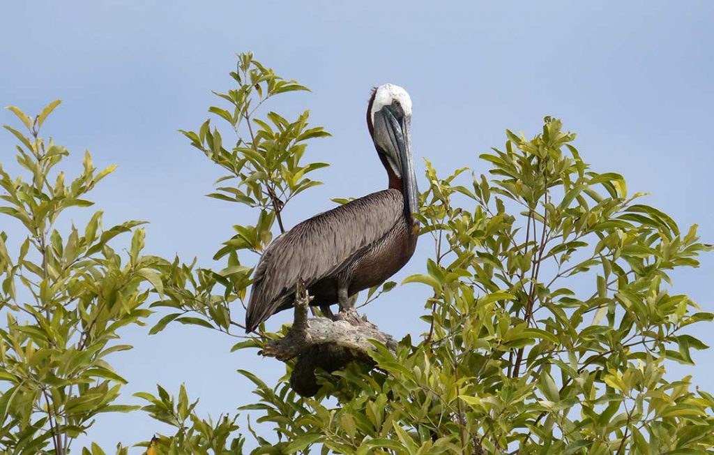 Der Playa Mansa war wirklich sehr schön gelegen. Hier hatten sich auch schon einige Badelustige einen schattigen Platz gesucht. Wir breiteten unsere Handtücher im Schatten von Mangroven aus und badeten anschließend in dem warmen Wasser. Im flachen Wasser konnten wir kleine Haie beobachten. Ein Pelikan hatte es sich in der Krone einer Mangrove bequem gemacht und ließ sich nicht stören und einige zutrauliche Finken wollten unbedingt meine Waffel mit mir teilen.