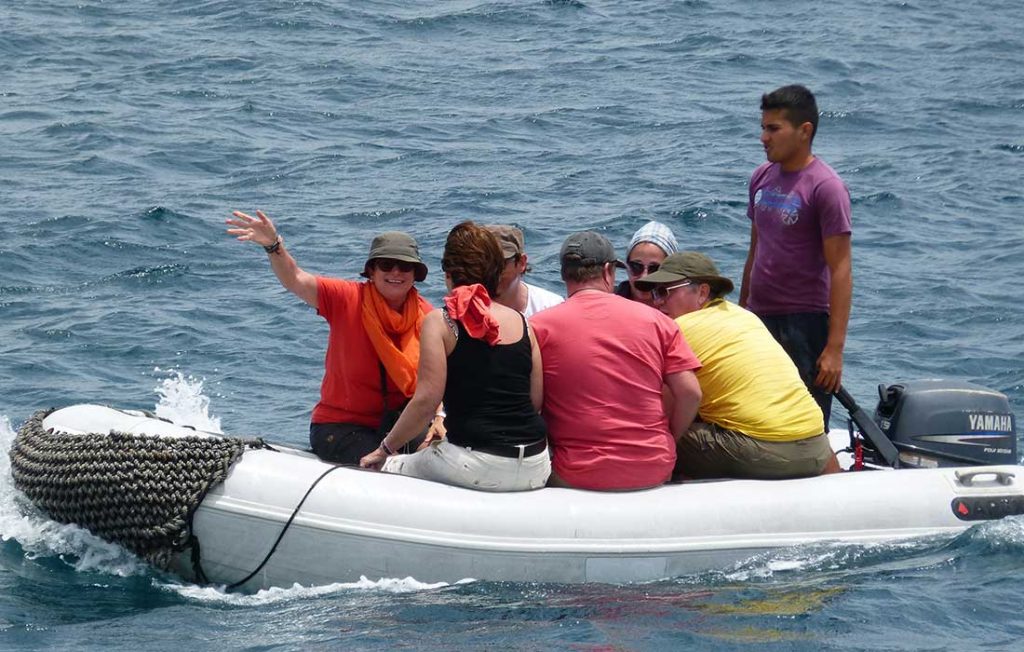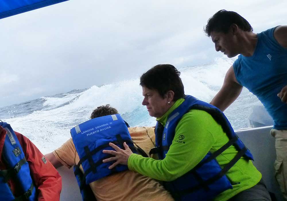 Am Anfang machte allen die schnelle Fahrt mit dem kleinen Boot noch Spaß. Obwohl das Meer nicht allzu unruhig war, hüpfte das Boot allerdings doch ständig hoch und schlug mehr oder weniger hart wieder auf. Mit der Zeit wurden die Gesichter immer blasser und die ersten Teilnehmer beugten sich über den Bootsrand, um die Fische mit ihrem halbverdauten Frühstück zu beglücken. Der Bootsmann kam mit dem Verteilen von Plastiktüten kaum nach.