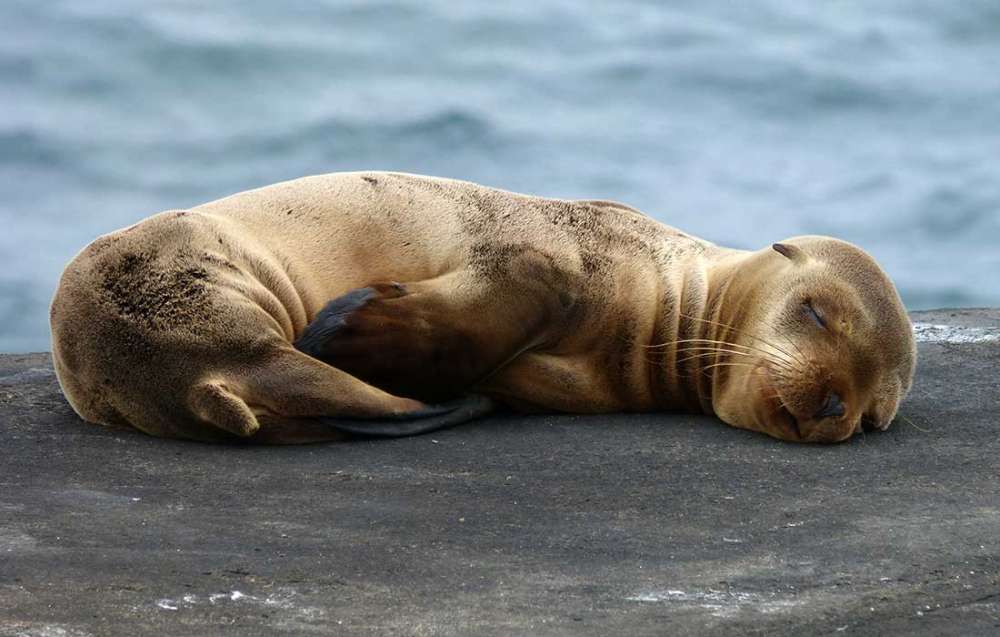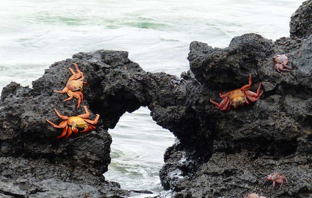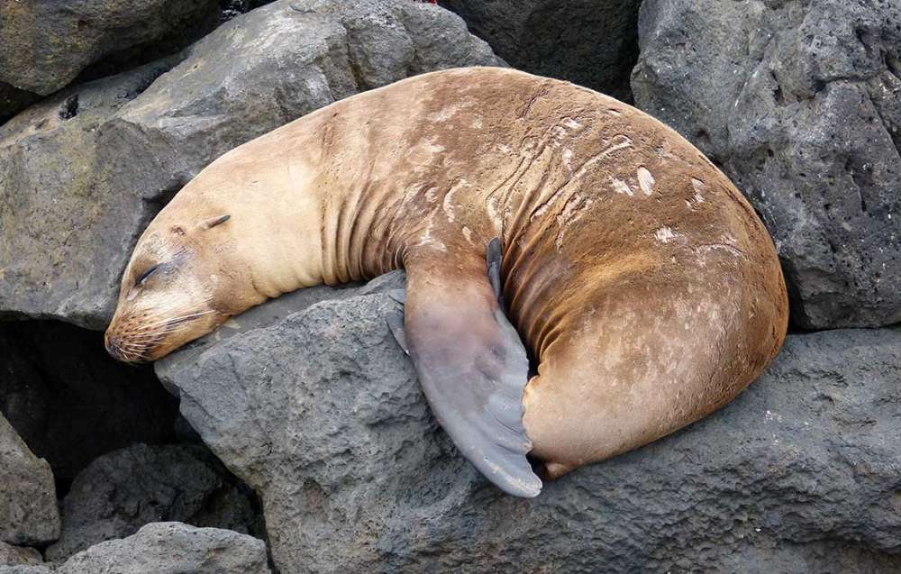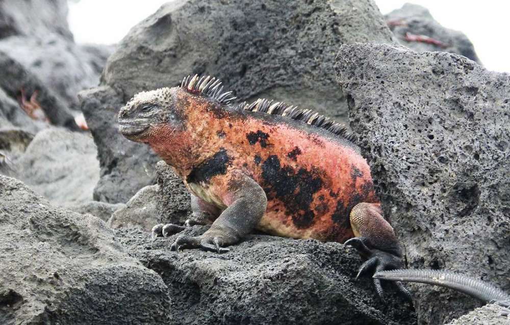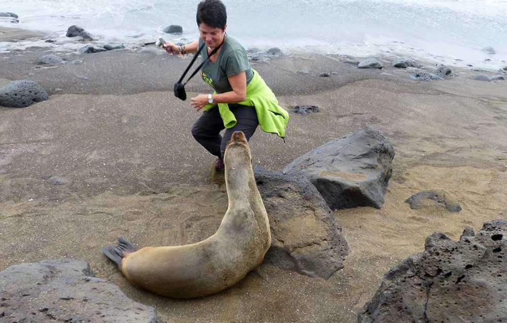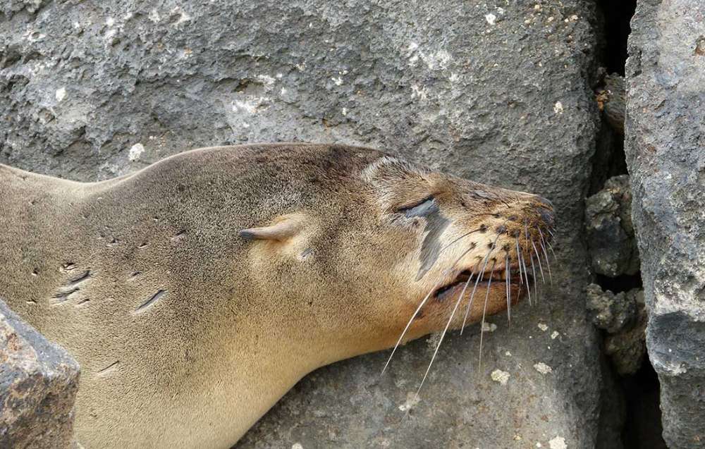 Auf der Insel angekommen, bekamen die blassen Gesichter wieder etwas Farbe und wir konnten eine einstündige leichte Wanderung unternehmen, auf welcher uns viele possierliche Robben, Seelöwen und Echsen begegneten. Auch die Krabben auf den Felsen am Meer waren sehr hübsch. Leider war der Himmel heute bedeckt und die Sonne ließ sich nicht blicken.