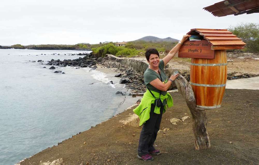 Nach dem Mittagessen in der sehr schönen Wittmer Lodge besuchten wir die Poststation auf Floreana, kauften eine Ansichtskarte, adressierten sie an unsere Heimatadresse und steckten sie in das als Briefkasten umfunktionierte Holzfass am Strand. Sie ist tatsächlich einige Wochen später zu Hause angekommen!