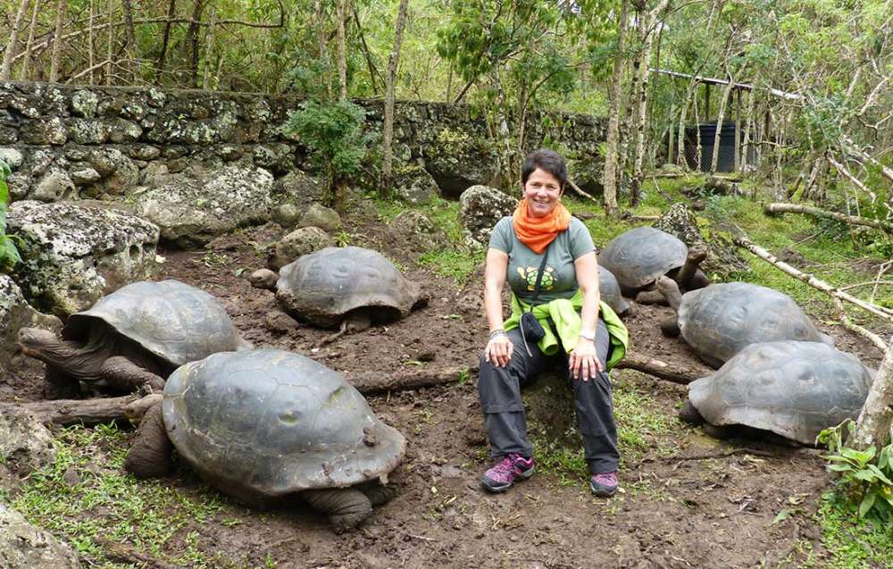 Danach stiegen wir in einen offenen Bus und fuhren ins Inselinnere. Dort unternahmen wir eine dreistündige Wanderung und besuchten unterwegs in einem Regenwald eine Station mit riesigen Galapagos-Schildkröten. Die Tiere können sich dort relativ frei bewegen und kommen regelmäßig zur Fütterung.