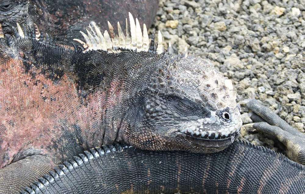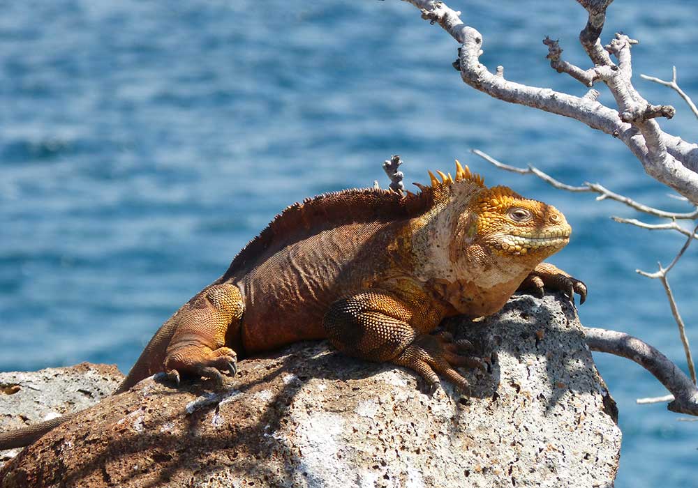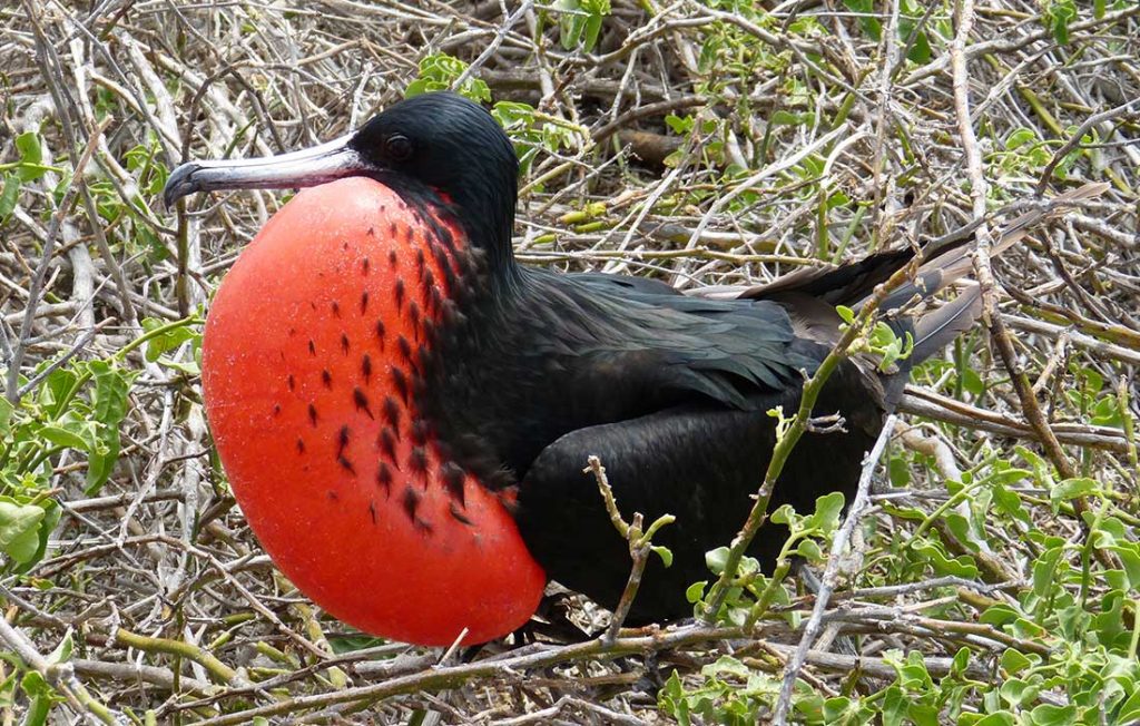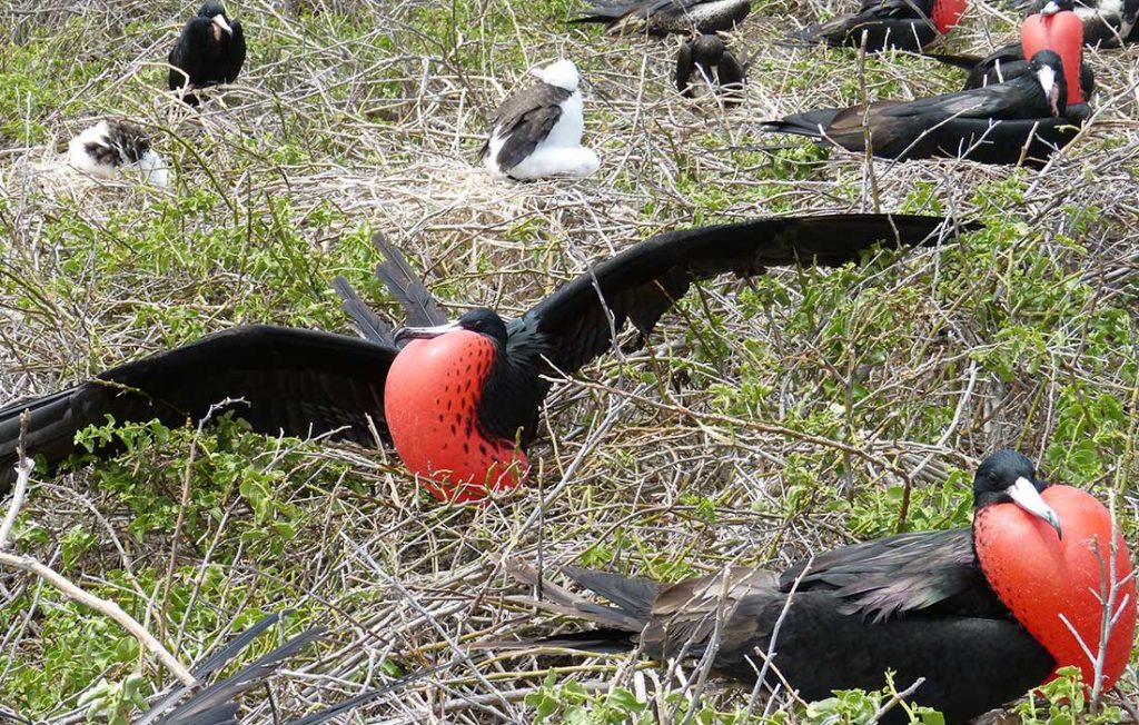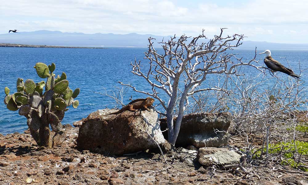 Anschließend gab es auf dem Boot ein gutes Mittagessen und wir schipperten weiter bis zur Insel Nordseymour. Uns erwartete dort einer der Höhepunkte der Reise. Kaum hatten wir das steile Ufer erklommen entdeckten wir neben Robben und Echsen große Kolonien von beeindruckenden Prachtfregattvögeln bei der Balz.